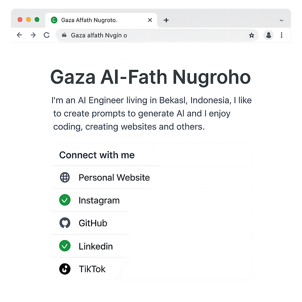 I'm an AI Engineer living in Bekasi, Indonesia. I like to create prompts to generate AI and I enjoy coding, creating websites and others.